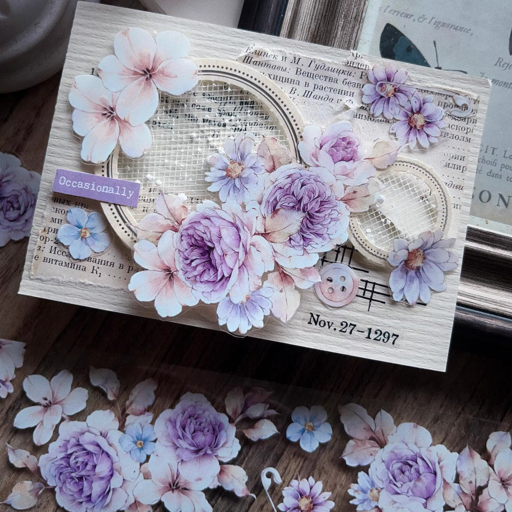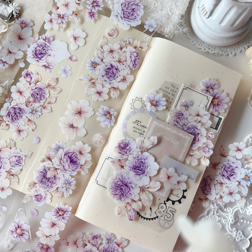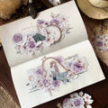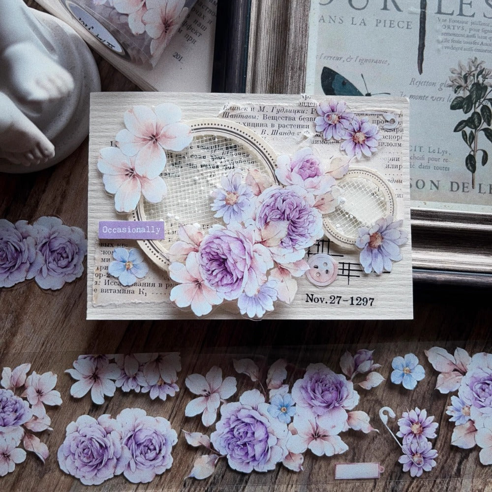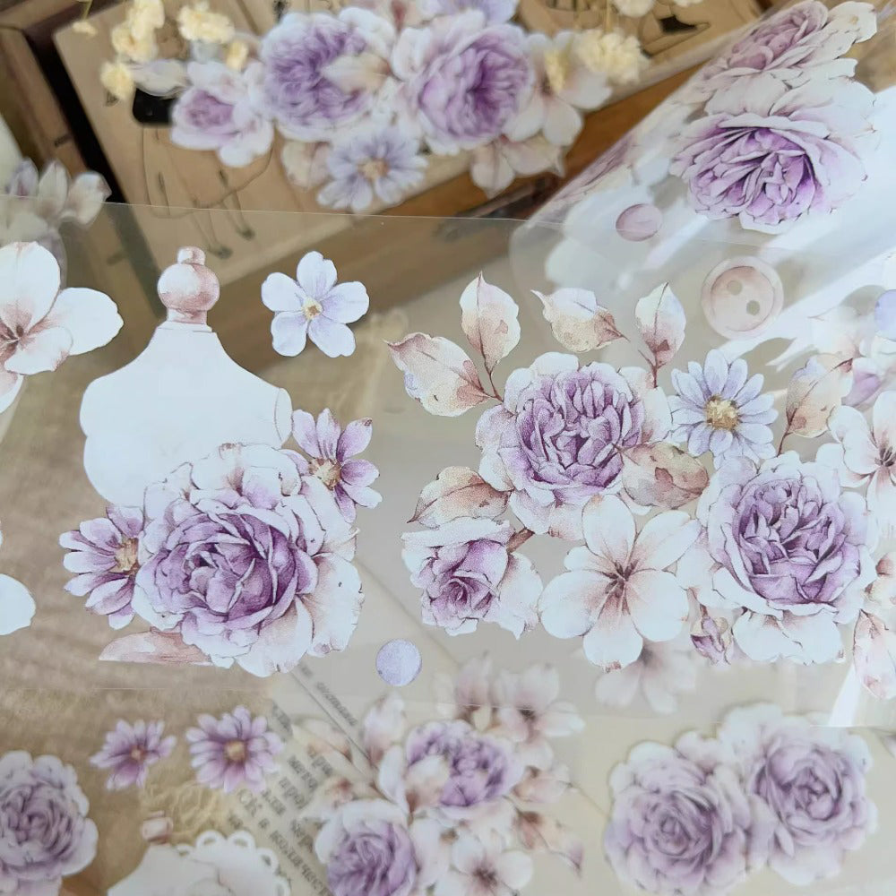Murayama Purple Vintage flowers theme Tape ,creatively designed with elements of flowers, sewing tools and buttons. The color is gentle and elegant, perfect for adding a touch of sophistication to all your creative projects.
